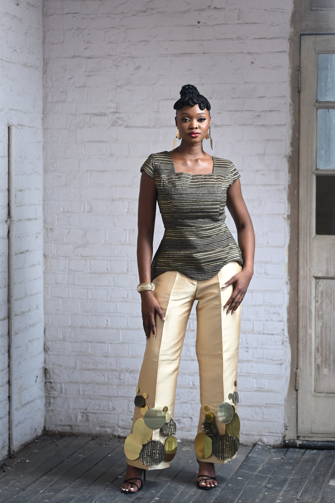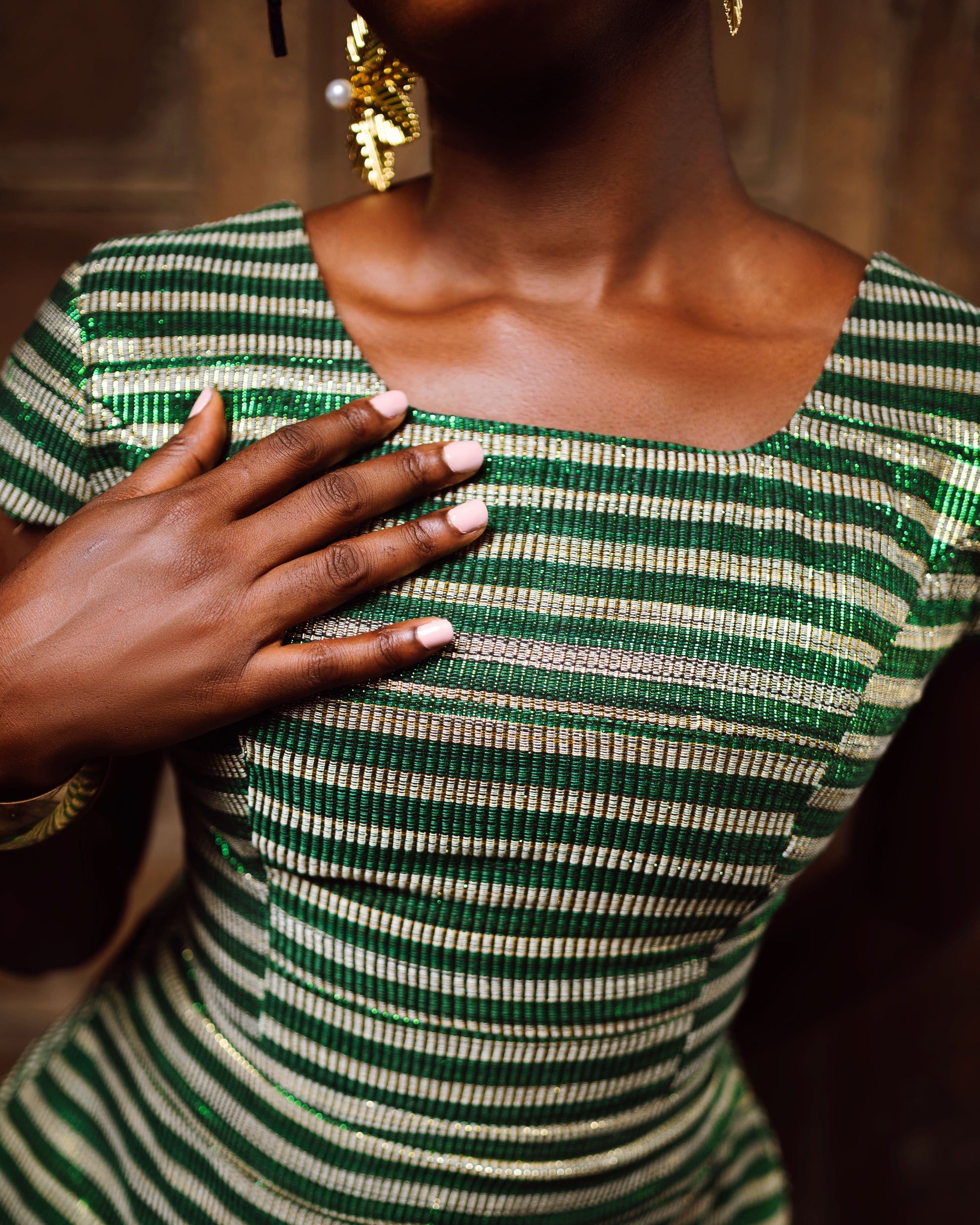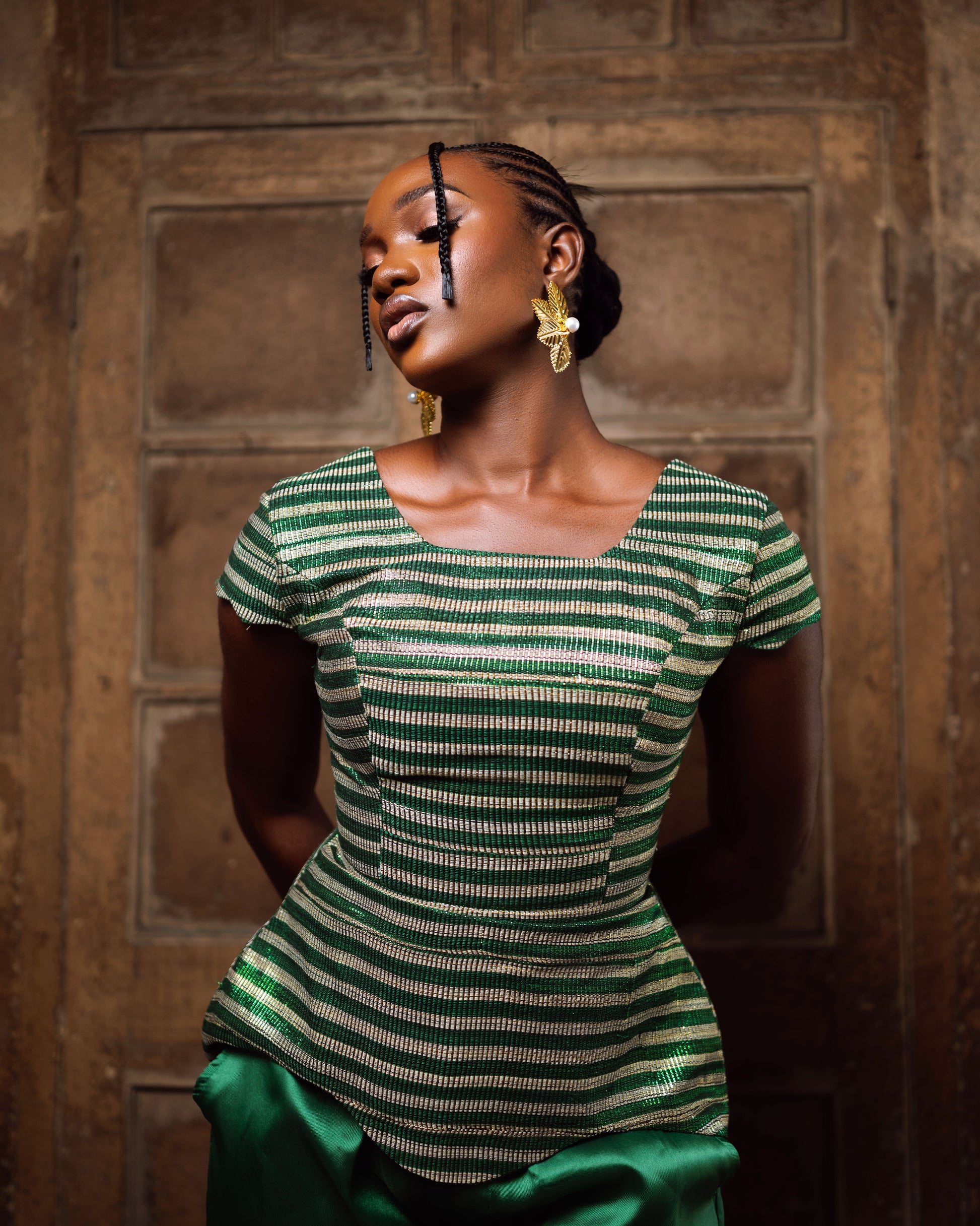 Crafted in shimmering green-and-gold striped fabric, the blouse mirrors the visual poetry of Yoruba festivities: the glow of evening lights on woven textiles, the rhythm of drums, the gathering of women adorned in fabrics chosen with joy.